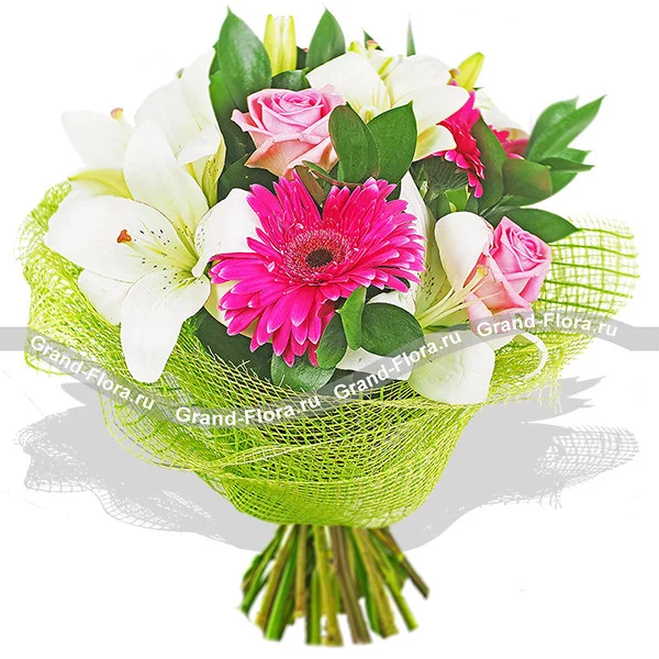 Стандартный (на фото): роза розовая (аква) - 5 шт., гербера малиновая - 3 шт., лилия белая - 2 шт., рускус, сетка зеленая. Примерный диаметр букета 45х45 см.